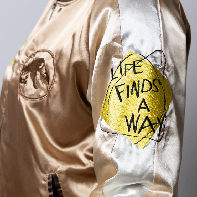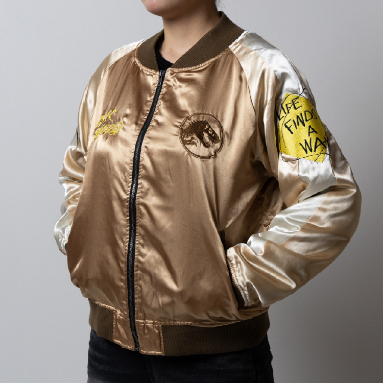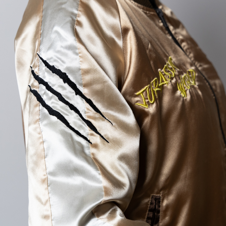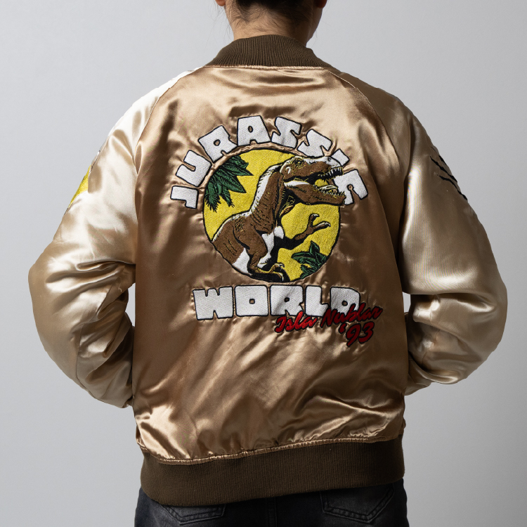- 背面にはジュラシックワールドにも登場するティラノサウルスが刺繍されている豪華なスカジャンです。