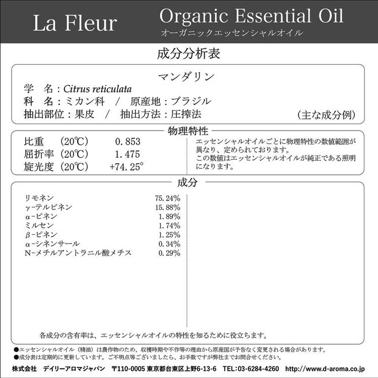 ラ・フルール オーガニック エッセンシャルオイル マンダリン 2ml