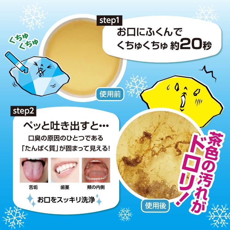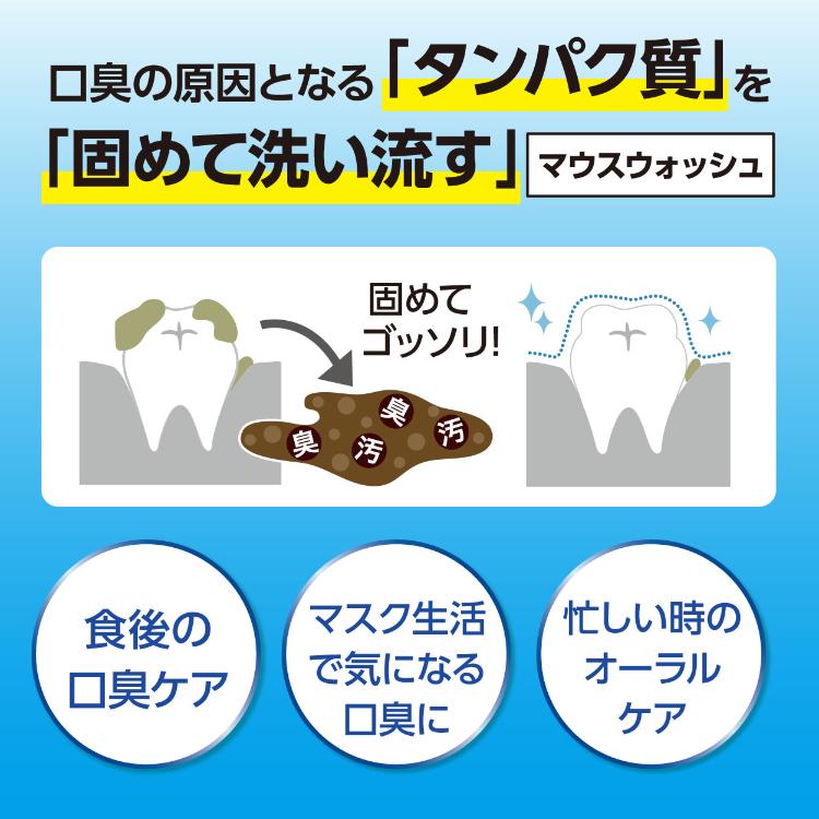 • お口の中の汚れ、磨き残しを除去し、口臭の原因のタンパク質を固めて洗い流す口内洗浄液です。