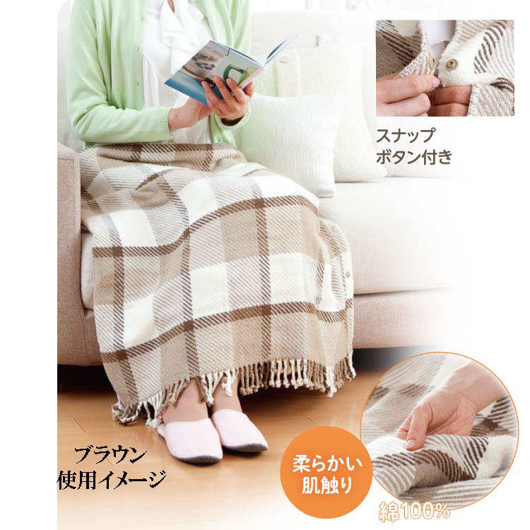 - ちょっと大きめなサイズなので、膝掛けだけではなく肩にかけたり、腰に巻いたりと様々な使い方ができます。ベージュをベースカラーとした落ち着いた色合いのチェック柄が、どんなお部屋にもマッチします。