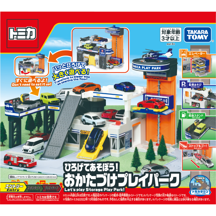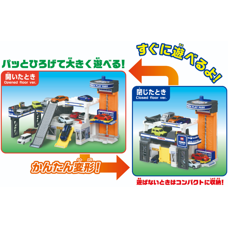 - 収納時はコンパクトにトミカを収納、フロアがくるっと回転して楽しくおかたづけができます。