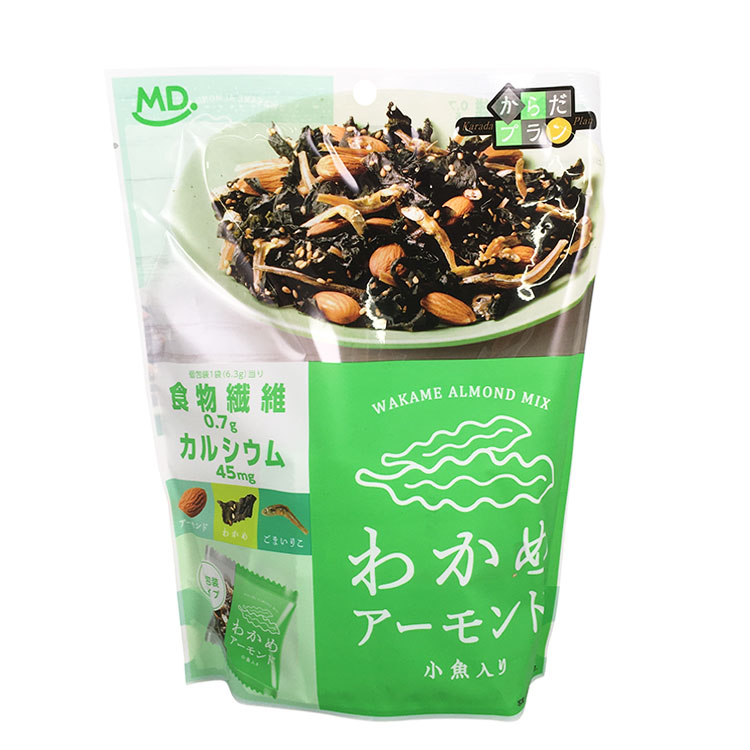 香ばしい胡麻仕立てのサクサクわかめに、アーモンドとごまいりこをミックスした、体にうれしい組み合わせのおやつです。