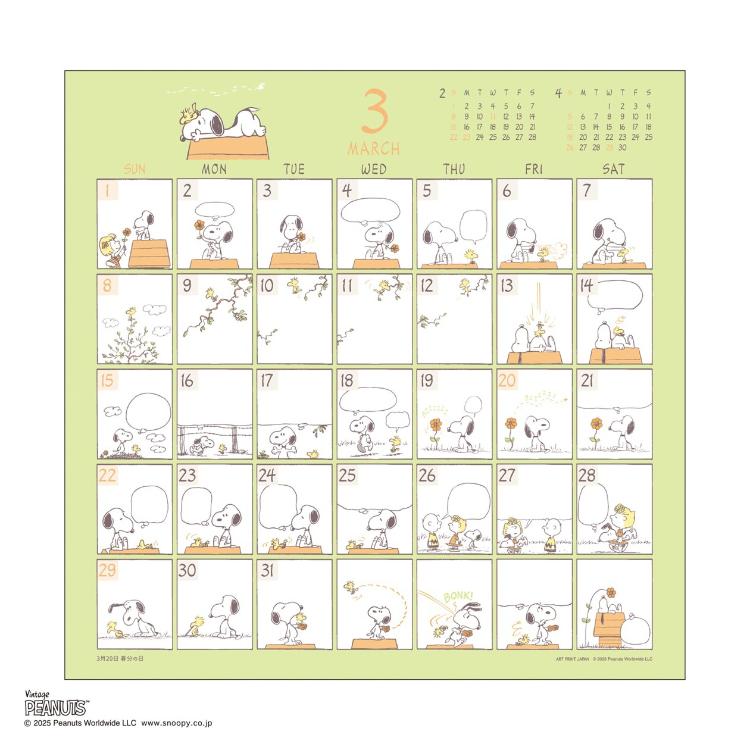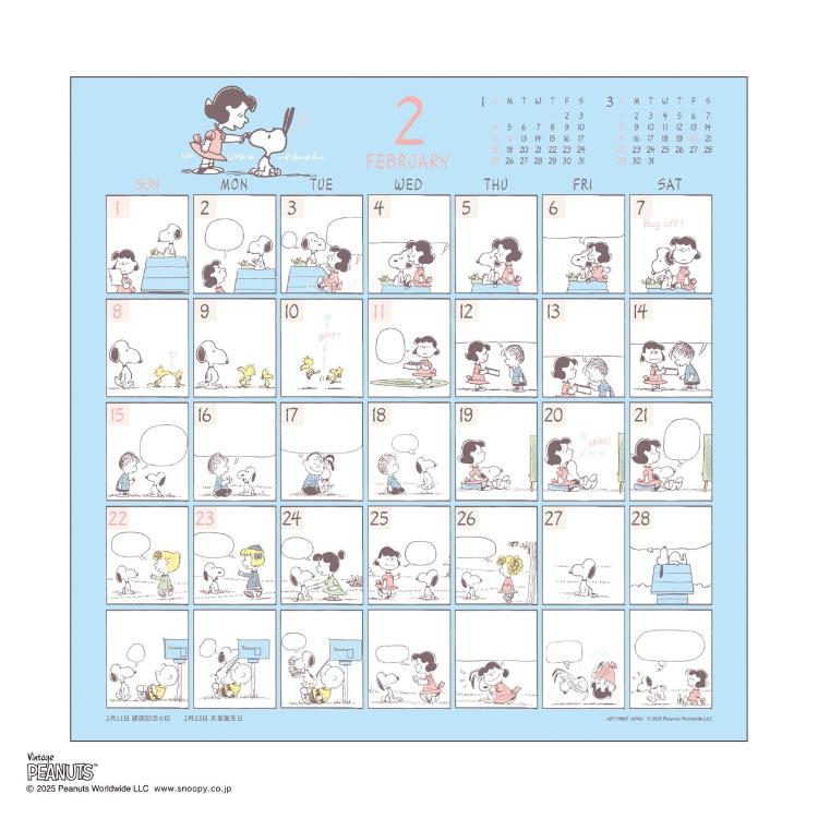 スヌーピーコミック柄のかわいいデザイン壁掛けカレンダー。