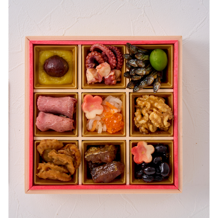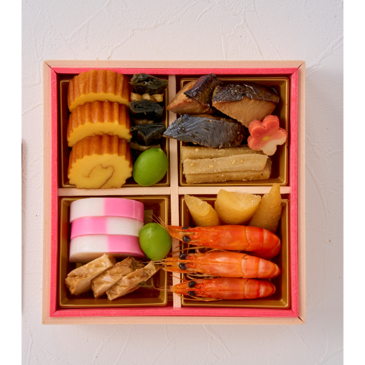 (一の重)伊達巻、ひと口昆布巻、若桃甘露煮、減塩鰆照焼、梅麩、減塩たたき牛蒡、紅白かまぼこ、チキン二色巻、減塩数の子、減塩海老の旨煮