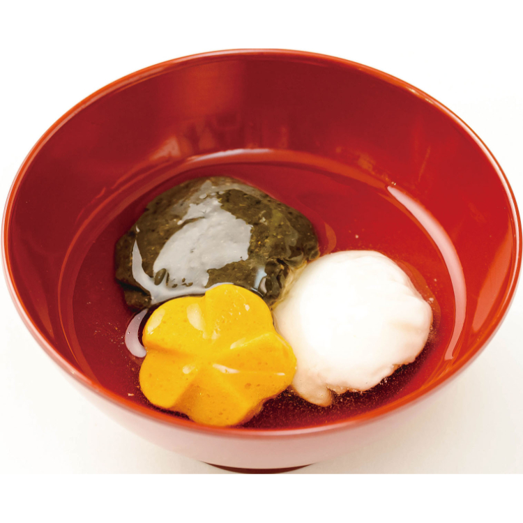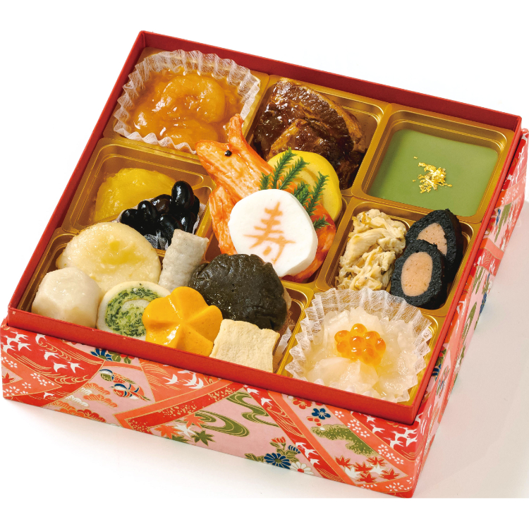 (一の重)エビチリソース煮、やわらか豚角煮、抹茶ムース、きんとん、黒豆、ふわふわ伊達巻、やわらか海老の艶煮、寿かまぼこ、湯葉のちりめん山椒和え、やわらか昆布巻、ほぐし魚の西京焼、里芋六方の煮物、やわらかごぼうの煮物、なごみ巻(ほうれん草)、椎茸しんじょうの煮物、ふんわり高野豆腐、花形人参の煮物、なますゆず風味いくら添え