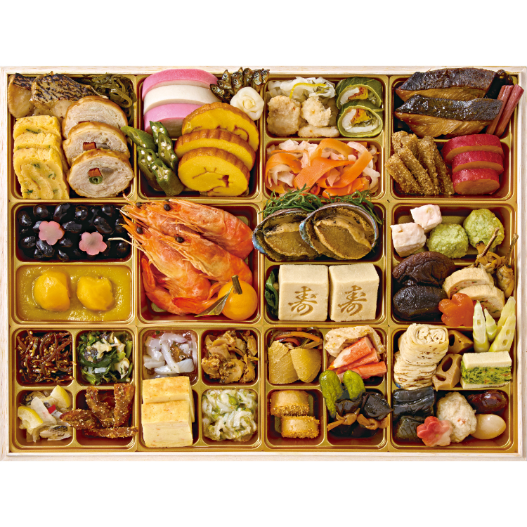 (一の重) 真鯛幽庵焼、糸昆布柚子和え、九条葱入り玉子焼、若鶏の三色巻、紅蒲鉾、白蒲鉾、田作り煮、百合根甘露煮、オクラの浅漬、伊達巻、かぶら甘酢漬、カマス梅肉南蛮、のどぐろ広島菜巻、紅白なます、わかめ煮、ぶり照焼、はすの芽(梅酢風味)、たたきごぼう、鳴門金時芋レモン煮、黒豆煮(梅型百合根羊羹)、きんとん、栗甘露煮、 有頭海老、葉付金柑甘露煮、糸昆布酢炊き、鮑旨煮、小松菜と揚げの煮物、寿高野豆腐、海老新丈、たら野菜つみれ、椎茸柚子煮、?照焼松葉串、蟹とほうれん草の信田巻、梅型蒟蒻、いかなごかつお節和え、アカニシ?と菜の花の昆布和え、こはだレモン、丸穴子南蛮、いかの彩り和え、つぶ?時雨煮、 蟹ふくさ焼、帆立生姜和え、松前漬、数の子、大根焙煎胡麻サラダ、蟹風味蒲鉾土佐酢漬、真子旨煮、小胡瓜酢漬、鰊昆布巻、焼き湯葉巻、蓮根旨煮、姫竹旨煮、博多高野(ほうれん草)、茄子の含め煮、ホッケつみれ、白花豆煮、紫花豆煮、梅麩