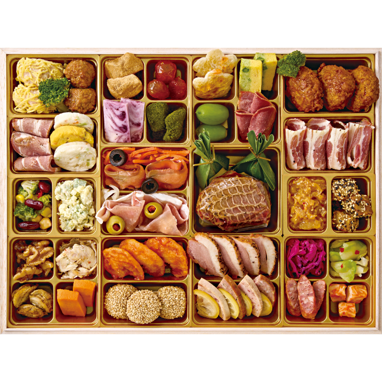 (二の重) 錦糸玉子包み、肉団子、ブロッコリー(コンソメ風味)、わらび餅、ドライトマト(赤ワイン風味)、ブルーベリーチーズソース寄せ、抹茶わらび餅、焼蒲鉾(チーズ風味)、うぐいすふくさ焼、若桃甘露煮、豚タン、ハンバーグ、ローストポーク、豆乳と野菜の新丈、豆乳と野菜の新丈(かぼちゃ)、アンデスポーク、キャロットラペ、ブラックオリーブ、スモークサーモントラウト、オニオンマリネ、生ハム、グリーンオリーブ、牛肉笹包み、ローストビーフ、ブロッコリー彩りレモンサラダ、魚卵のサラダ、中華くらげ、さつまいも胡麻和え、くるみ甘露煮、桜島どりマリネチキン、帆立香草焼、雲丹チーズソース寄せ、海老チリソース、胡麻団子、合鴨パストラミ、ボロニアソーセージ、牛タン入ソーセージ、レモンシロップ漬、レッドキャベツのラペ、ザーサイ、サラミ風ソーセージ、海鮮新丈