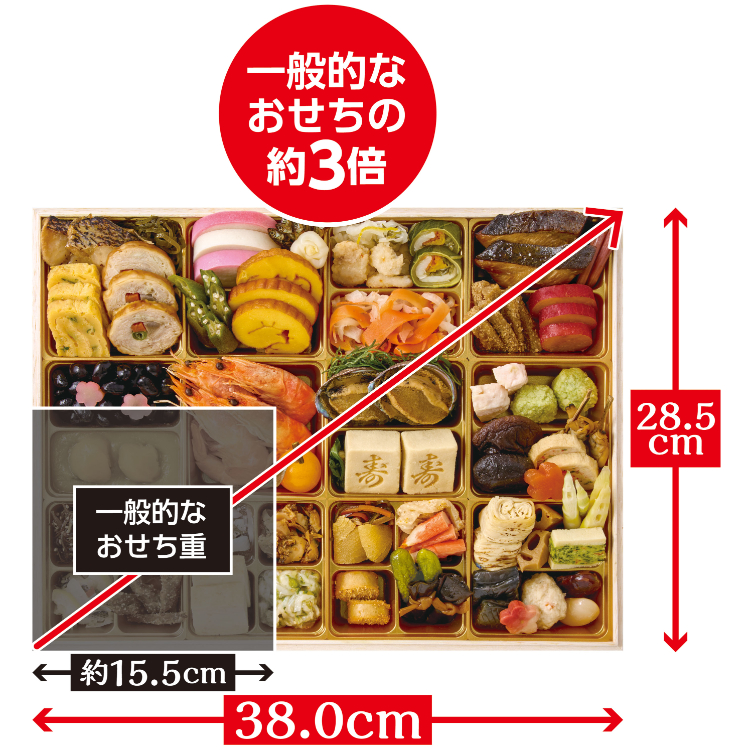 お重サイズ(外寸)縦:285㎜×横:380㎜×高さ:137㎜(内寸(1段):47㎜)