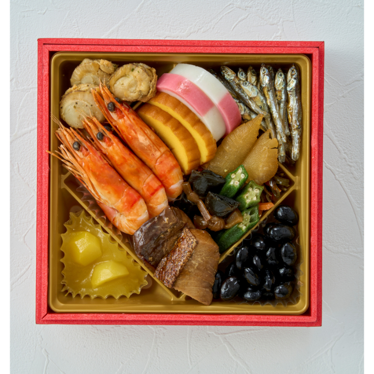 (一の重)帆立香草焼、田作り煮、紅白蒲鉾、伊達巻、有頭海老、松前漬、数の子、オクラの浅漬、鰊昆布巻、ぶり照焼、きんとん、栗甘露煮、黒豆煮