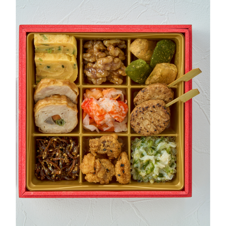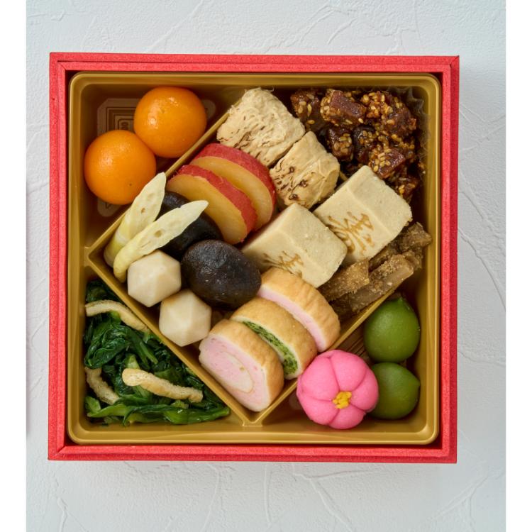 (二の重)金柑甘露煮、金ごま角煮、焼き湯葉巻、鳴門金時芋レモン煮、寿高野豆腐、姫竹旨煮、椎茸柚子煮、海老芋旨煮、たたきごぼう、の巻(海老)、の巻(ほうれん草)、小松菜と揚げの煮物、若桃甘露煮、花餅紅梅