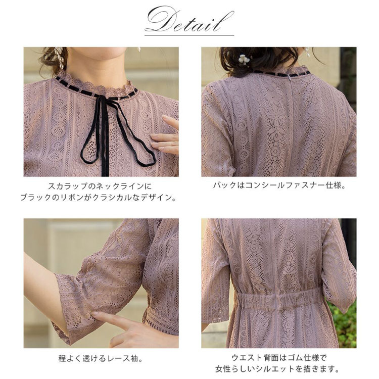 • スカラップのネックラインに細めのベロアリボンが女性の可愛らしさを演出。