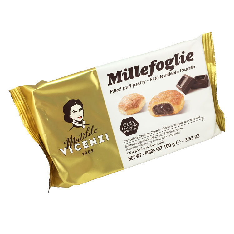 - バター入りの薄いパイ生地が192層にも重なる伝統的な技法と、厳選された原材料へのこだわりによって製造されたチョコレートクリーム入りのパイ菓子です。
