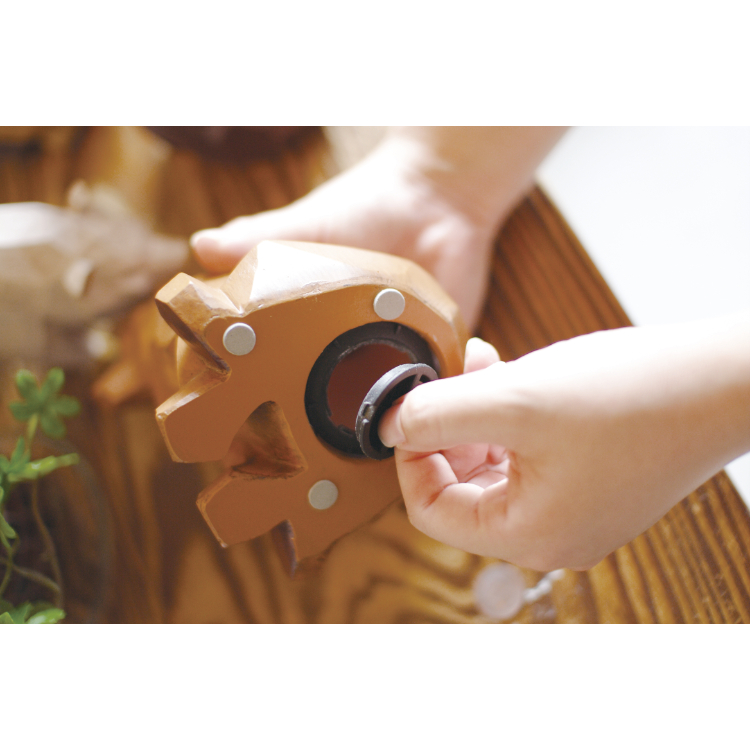 - まるで木彫りのようなアニマルマネーバンクシリーズ。割らずにお金を取り出せる仕様です♪