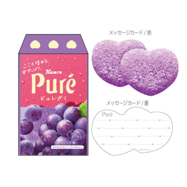 • グミ粒をイメージしたハート型のメッセージカードとピュレグミのパッケージそっくりの封筒。