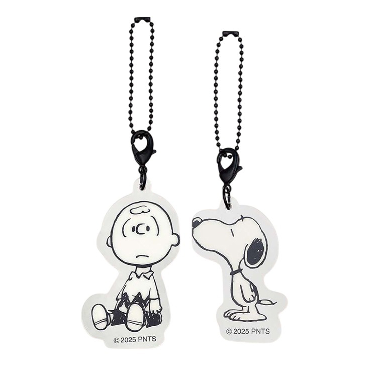 - モノクロの落ち着いた色合いと、スヌーピーとチャーリー・ブラウンがペアになったデザインのキーホルダー。