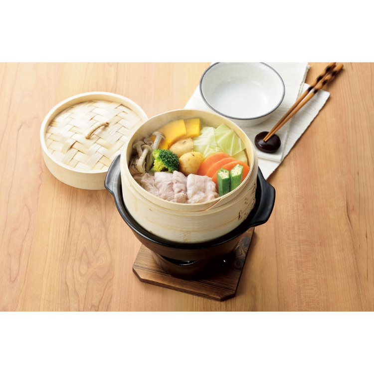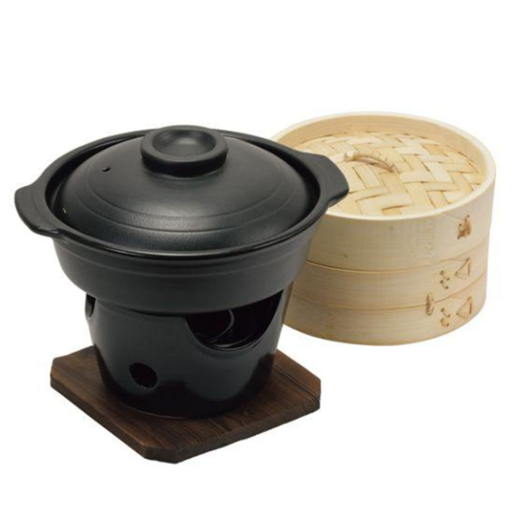 - 「蒸し料理」に対応する、せいろ付きの陶器鍋+コンロ+木台のセット
