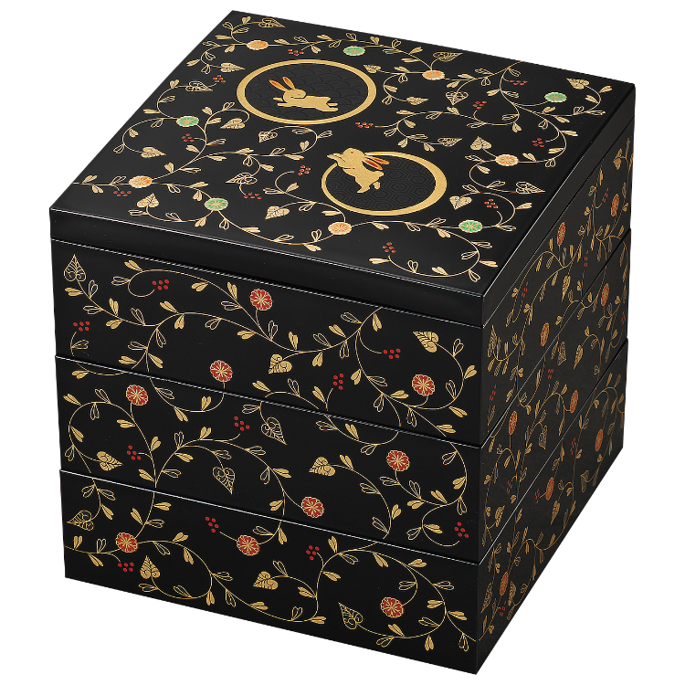- やわらかな表情のうさぎ柄と、縁起の良い唐草文様を組み合わせた「うさぎ唐草 5.0 三段重」。