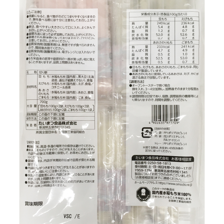 - 内容量:700g(豆もち100g×2袋、えびもち100g×2袋、あおさのりもち100g×2袋、ごまもち100g×1袋)