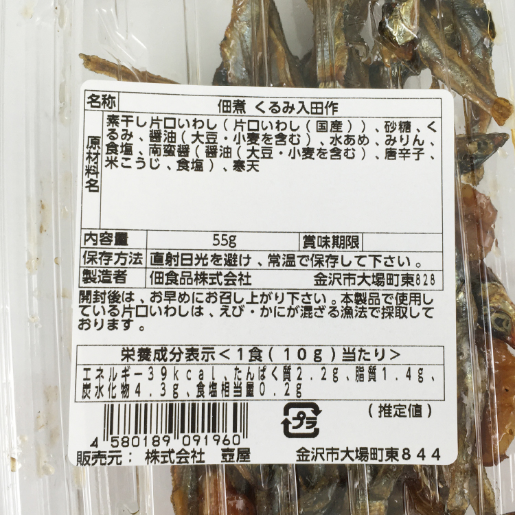 - 原材料:寒干し片口いわし(国産)、砂糖、くるみ、醤油(大豆・小麦を含む)、水あめ、みりん、食塩、南蛮漬(醤油(小麦・大豆を含む)、唐辛子、米こうじ、食塩、寒天