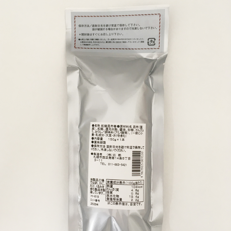 - 原材料:昆布(国産)、紅鮭、還元水飴、醤油、砂糖、かんぴょう、みりん/調味料(アミノ酸等)(一部に小麦・乳成分・大豆・さけを含む)