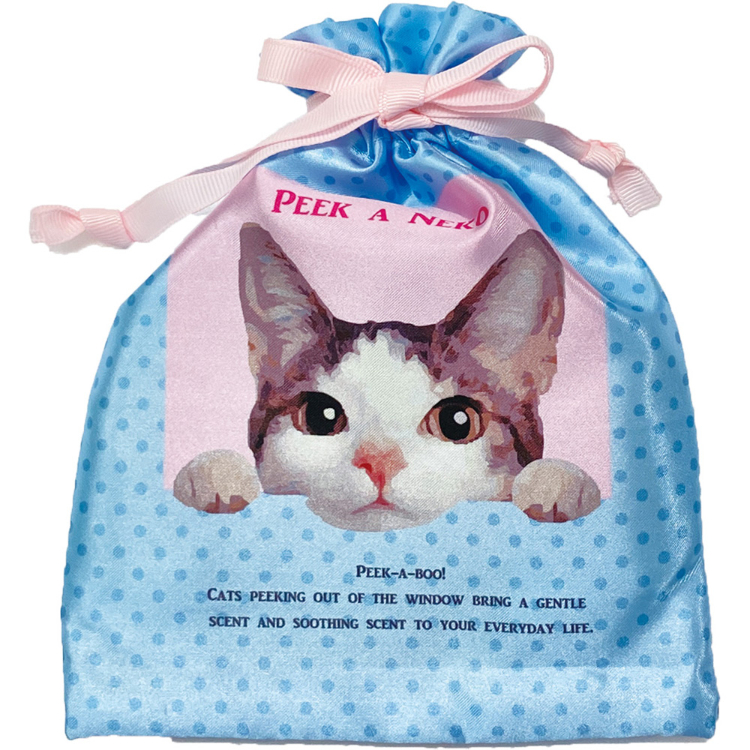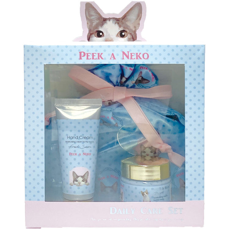 • 「PEEK A NEKO」シリーズの、かわいい猫デザインのギフトBOX入りのハンドクリーム、ハンド&ボディクリーム、きんちゃく袋のセット。