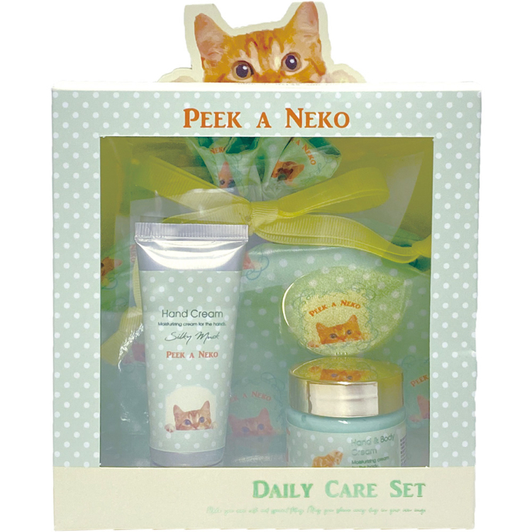 - 「PEEK A NEKO」シリーズの、かわいい猫デザインのギフトBOX入りのハンドクリーム、ハンド&ボディクリーム、きんちゃく袋のセット。