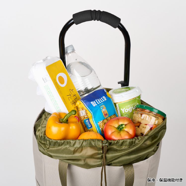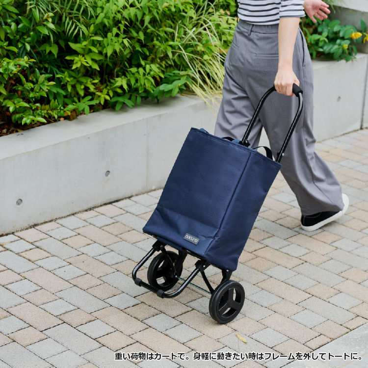 - コンパクトかつ容量たっぷりのトートバッグ型カート。取り外してショルダーバッグになる2way仕様だから、アクティブに使えて便利です。