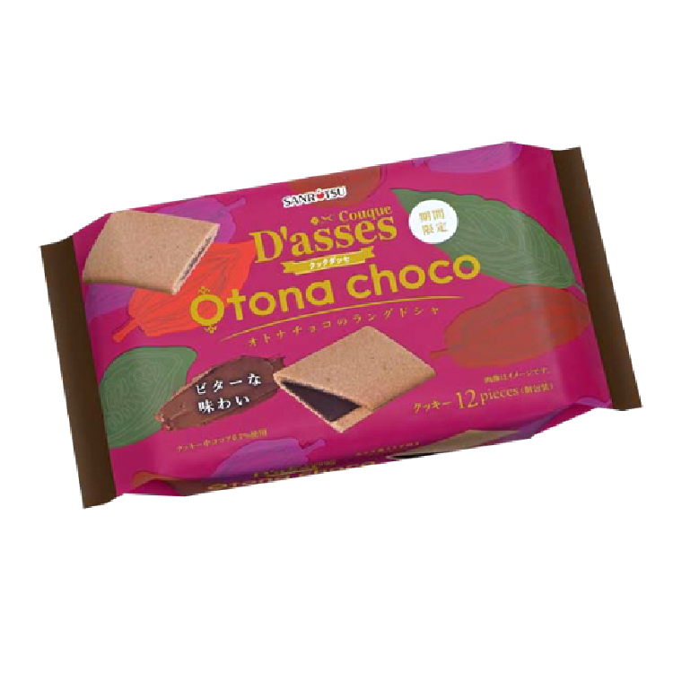 - 凖チョコレートを練り込んだラングドシャクッキー生地に、カカオ分の高いチョコレートクリームをサンド。
