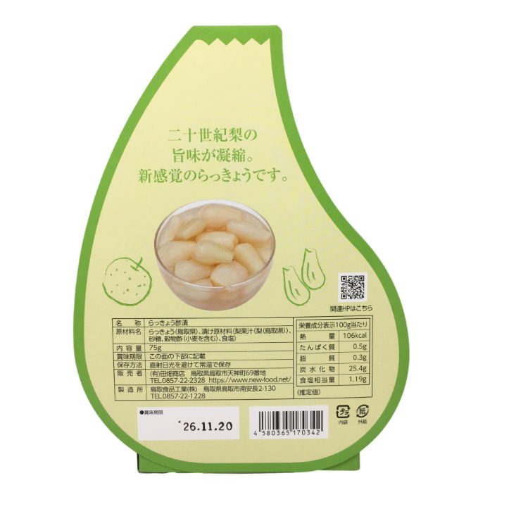 - 独特の風味から若い世代を中心に苦手とする方が多いらっきょうをオリジナル梨ソースで漬けることにより、らっきょうが苦手な方でも食べやすい、これまでにないフルーティーな新ジャンルのらっきょうに仕上げました。