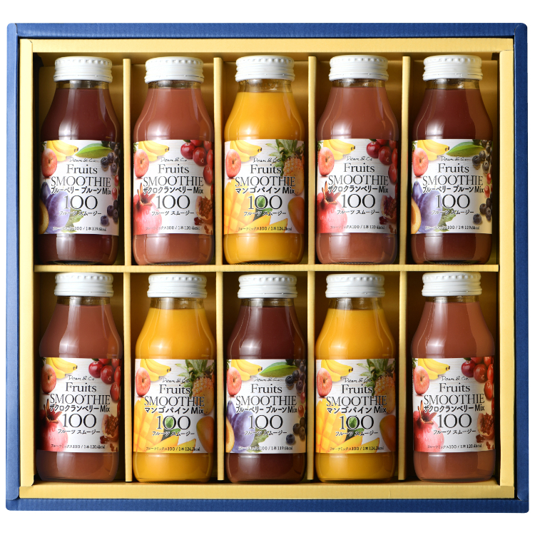 - フルーツや野菜の本来の美味しさを味わっていただくため、砂糖や香料を使用せず、果肉ごと搾ったスムージータイプの濃厚な100%ジュースです。