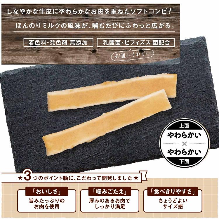 - 鶏ササミ、牛皮、コーンスターチ、全脂粉乳、乳酸菌、ビフィズス菌、グリセリン、ソルビトール、ミネラル類(カルシウム、ナトリウム)、酸化防止剤(ビタミンE)、ピロリン酸ナトリウム、保存料(ソルビン酸カリウム)