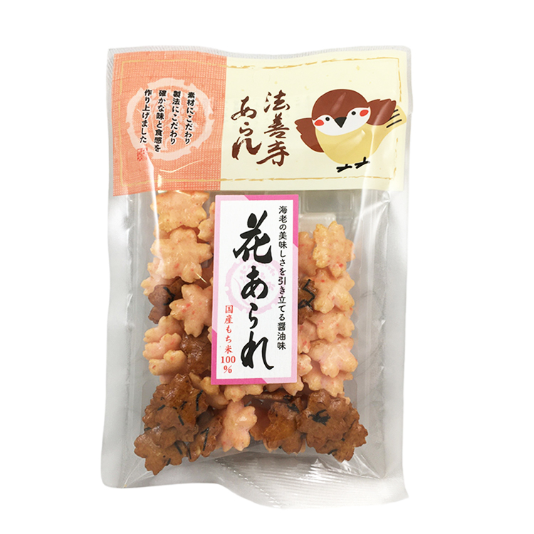 - 可愛い花形の海老あられと醤油あられのミックス商品です。