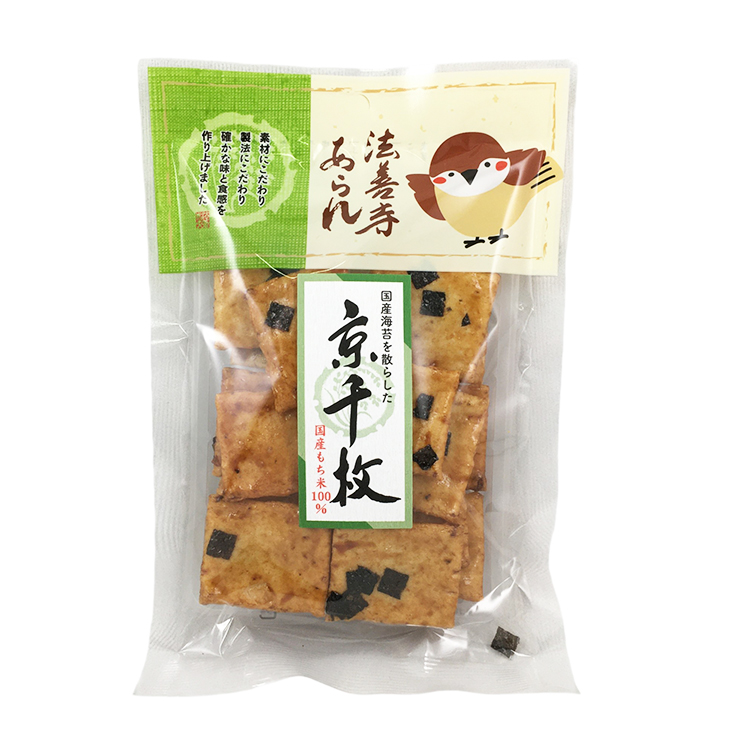 - 四角い薄型の甘口醤油あられに国産の上質な海苔を散らしました。