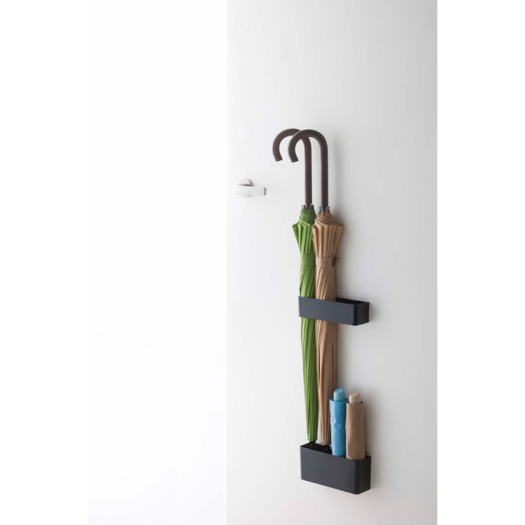 - 傘立てを置くスペースがない、とにかく省スペースで傘を収納したい方におすすめなマグネット式傘立てです。本体はスチール素材にマグネットが付いていて扉に貼り付けることが出来ます。また、上下2つに分かれており、お手持ちの傘に合わせて位置を調節できます。本体は600gと軽く、重さ2kgまで対応しています。シンプルなデザインで、どんな玄関にも合わせやすいです。