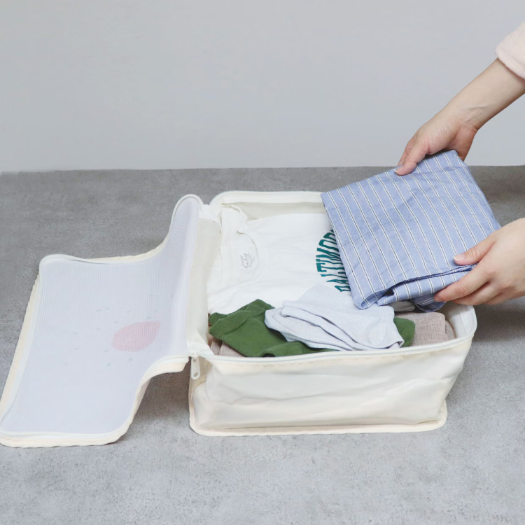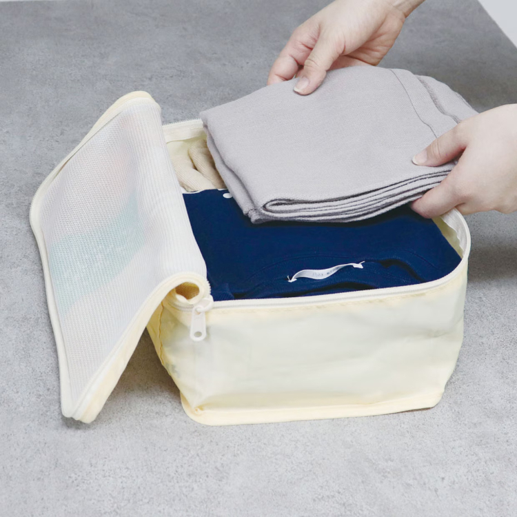 - Lサイズのポーチには、最大Tシャツ4枚、ジーンズ3枚が収納できる大容量(※素材やサイズによっては収納できる枚数は異なります)