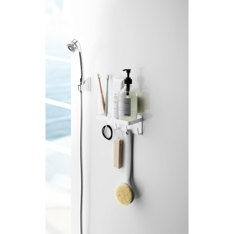 - バスグッズをまとめて収納。磁石の付く壁面の好きな場所に簡単に取り付けできるラック&フックです。ディスペンサーボトルの追加棚として便利です。シンプルですっきりとしたデザインは、まるで備え付けのようにバスルームに馴染みます。