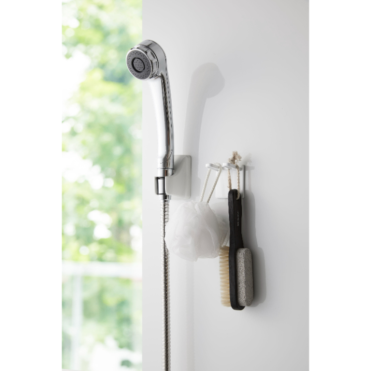 • T字のヒゲ剃りを引っかけるだけ。置き場所に困るブラシやバス小物の収納に。