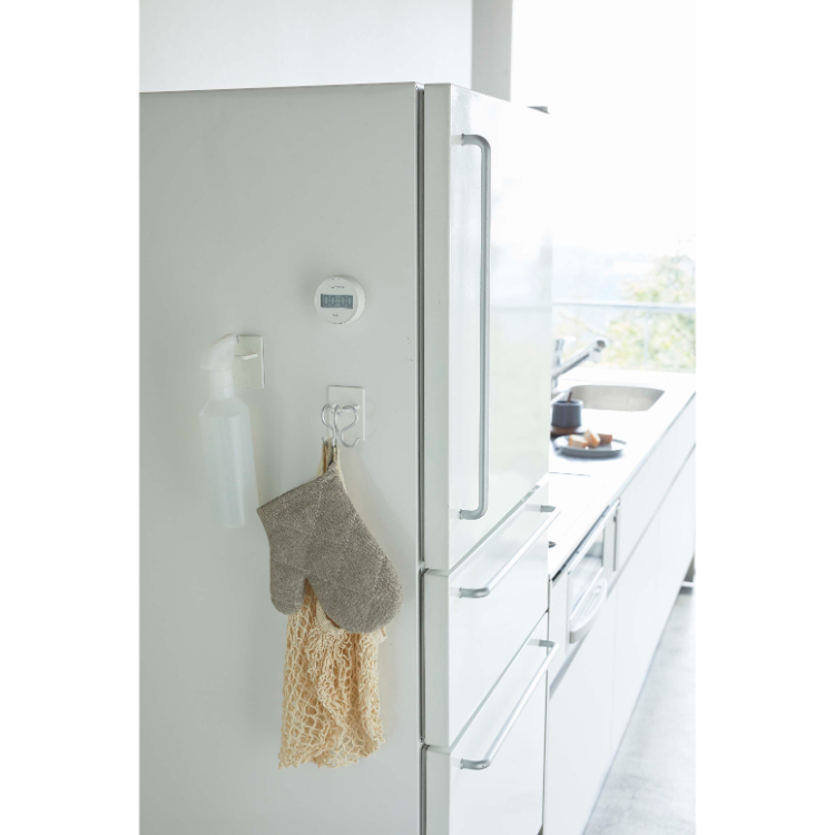 - マグネットで洗濯機や冷蔵庫にスプレーを設置しておけるマグネットスプレーフック2個組です。タテ・ヨコどちらの向きでも取り付けできるので、スプレーだけでなく、さっと使いたい小物を自由に引っ掛けて収納できます。