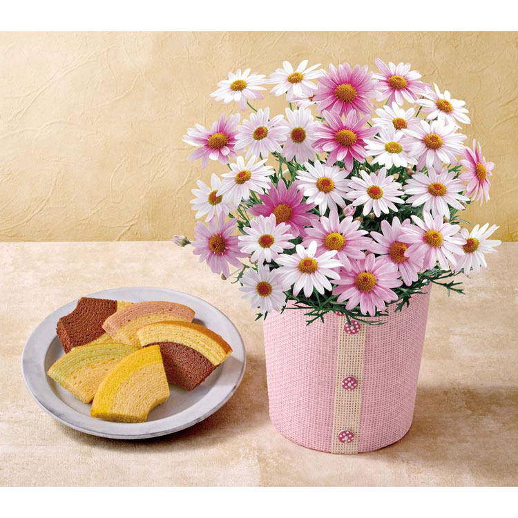 - 花色の変化が楽しめるマーガレット(さくらべーる)と「銀座千疋屋」の銀座フルーツクーヘンをセットでお届け。