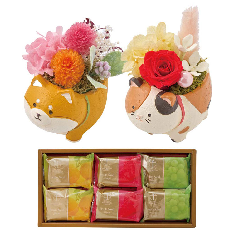 - プリザアニマル三毛猫×1、プリザアニマル柴犬×1、銀座千疋屋銀座フルーツサンド×1