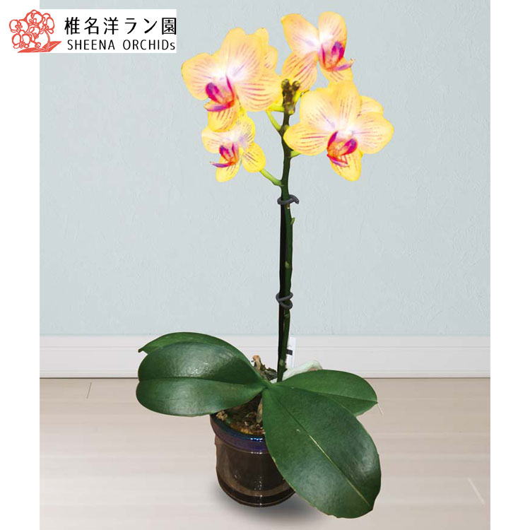 - ビタミンイエローの花色に赤いストライプが入る個性的な胡蝶蘭です。