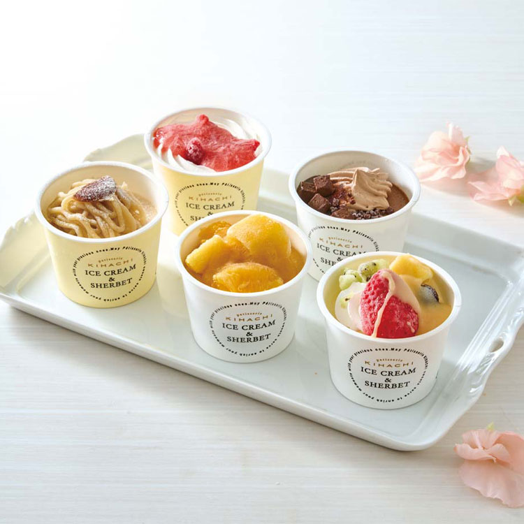 - 「パティスリー キハチ」看板商品のキハチトライフルロールやケーキからイメージしたパフェ仕立ての華やかなアイス&シャーベット。5種類の色とりどりのパフェアイスをお楽しみください。