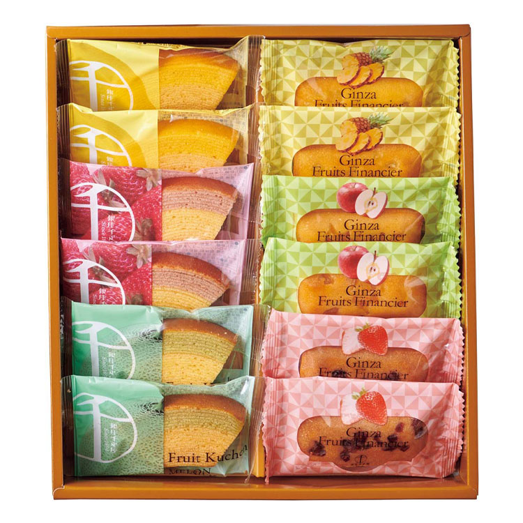 - 銀座フルーツクーヘン(メロン&ミルク、イチゴ&ミルク、レモン&はちみつ)3種各2個、銀座フルーツフィナンシェ(パイナップル、ストロベリー、アップル)3種各2個