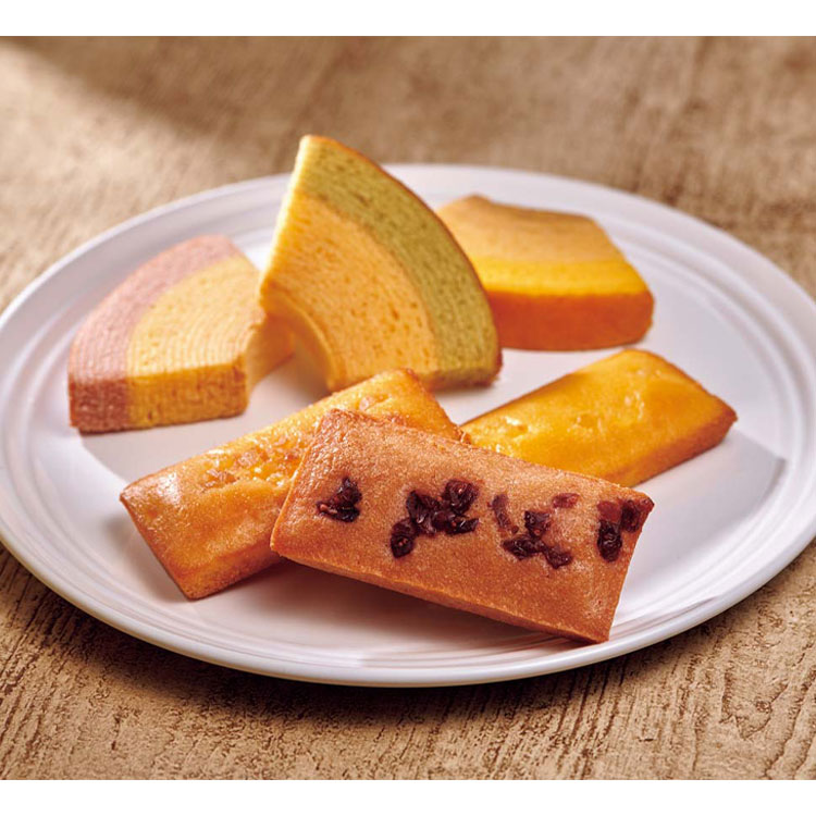 - 果汁を加えた生地を一層一層丁寧に焼上げたフルーツクーヘンと、フルーツピューレが入った生地を焼上げたフルーツフィナンシェの詰合せ。