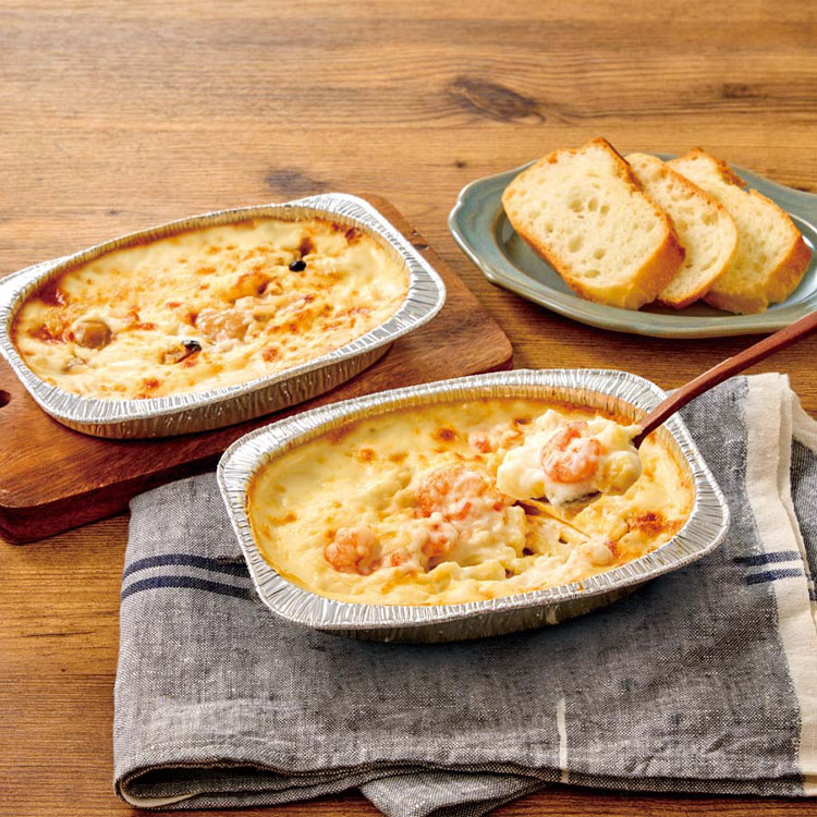 - ホワイトソースが特長の海老のマカロニグラタンときのこ香るチキンドリアをセットでお届けいたします。