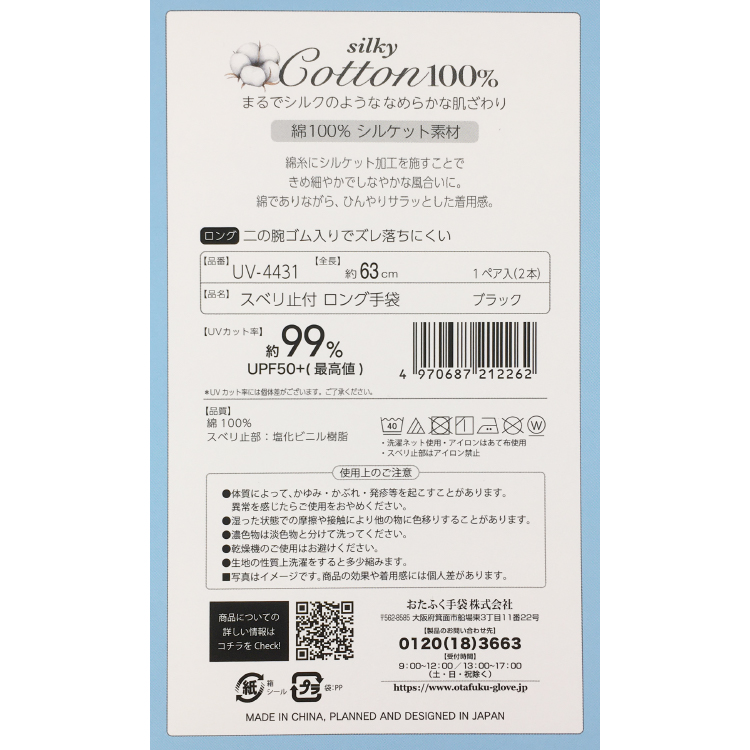 【おたふく手袋】silky Cotton100% UVカット ロング手袋 スベリ止付