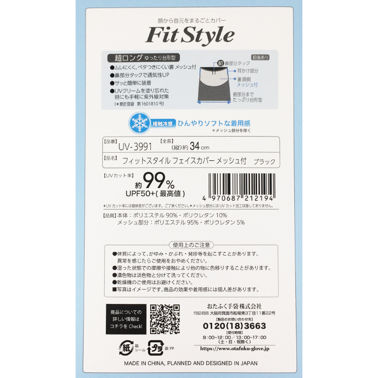 【おたふく手袋】Fit Style UVカット フェイスカバー メッシュ付き ブラック