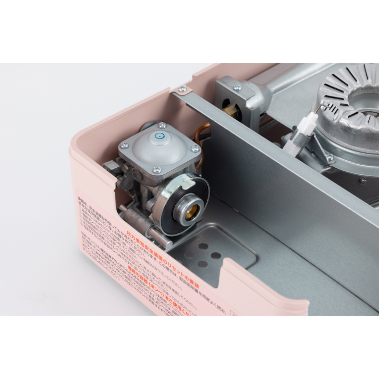 - 2つの安全機能で安心です。※1 圧力感知安全装置:ボンベが過度に熱せられボンベ内の圧力が異常に高くなると自動的に火が消えます。※2 容器装着安全装置:器具せんつまみが「OFF」の位置にないとボンベが装着できません。