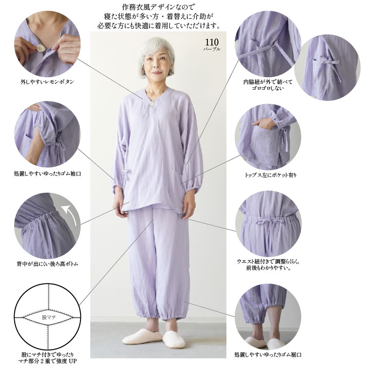 - ※サイズに関して:通常のM・Lサイズよりゆとりのある設計にしております。ご自身でのお着替え、ケアパートナー介助のお着替え時に快適に着用していただけるサイズです。