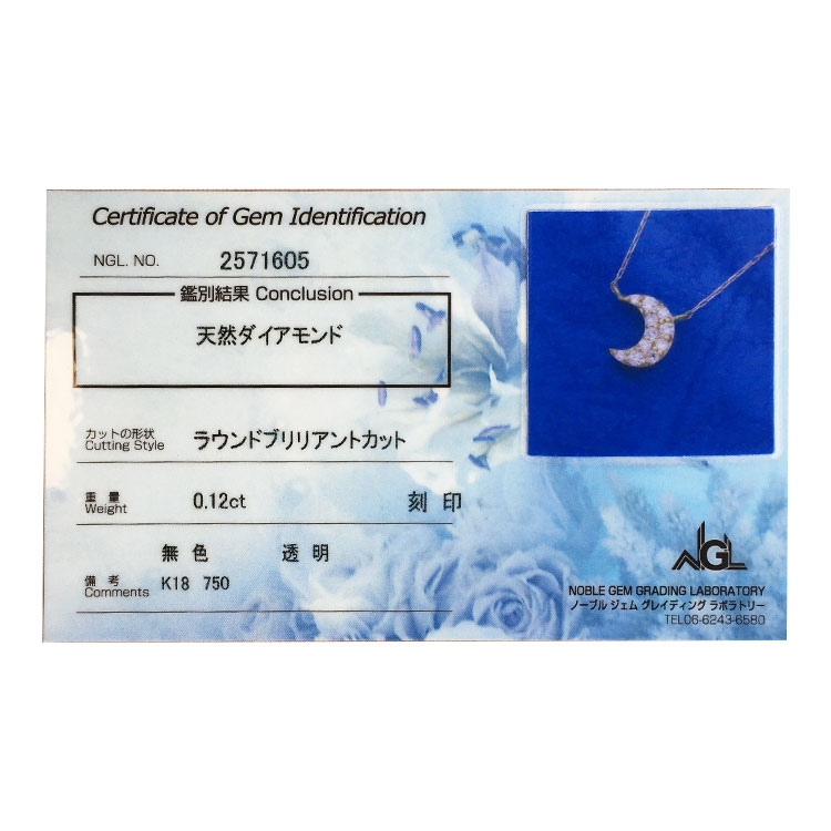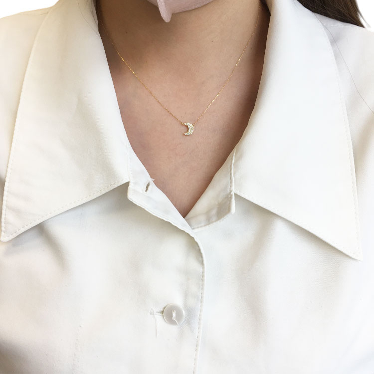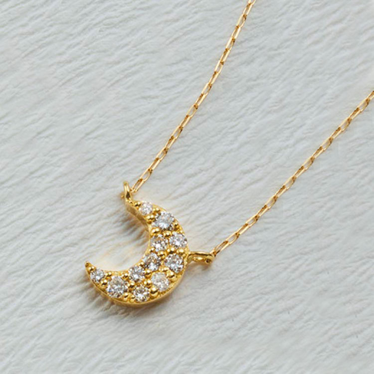- 三日月のデザインに11石のダイヤモンドをグラデーションでセッティングしたデザイン。繊細なチェーンを使い上品な印象